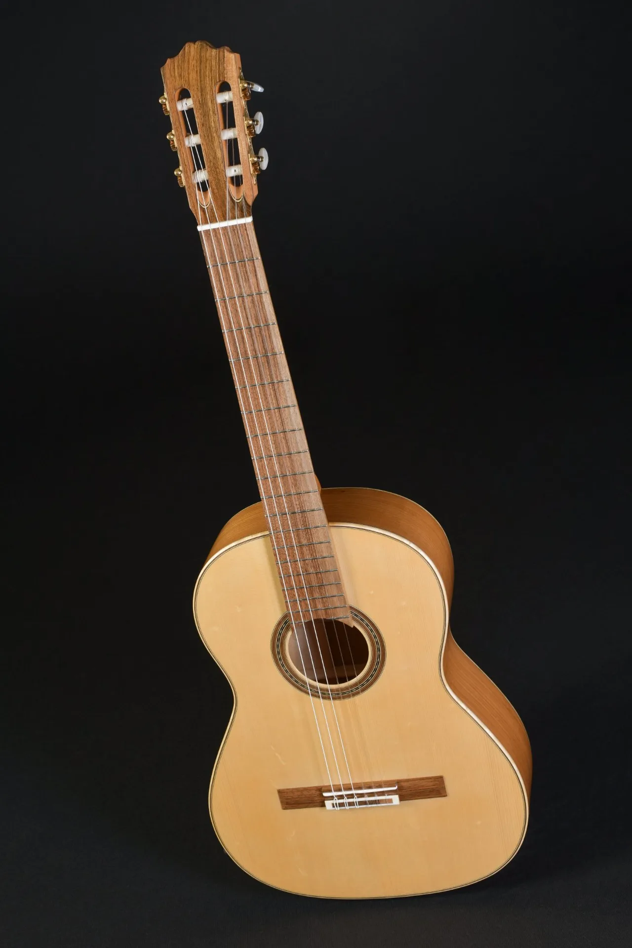SoldA fully local wood guitar — elm sides, alternating bands of elm and birds-eye maple on the back, walnut neck and fingerboard, all paired with a fine spruce top. The striped back is one of the most visually striking combinations to leave the workshop, each band of birds-eye maple shimmering against the warm amber elm. Fitted with gold tuners with mother-of-pearl buttons.